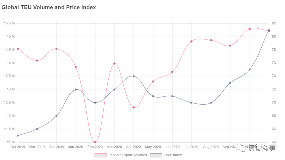 目前的集裝箱供應(yīng)鏈不僅僅是有運價高企的問題,還面臨著缺少集裝箱設(shè)備的具體難題。談到缺箱問題時,馬士基集團首席商務(wù)官、馬士基海運物流業(yè)務(wù)首席執(zhí)行官柯文勝表示,出現(xiàn)這種情況是因為2020年第三和第四季度的“巨大”需求所致。他表示:“這意味著,全球沒有足夠的集裝箱來滿足我們目前的需求。”那么,從2020年年底的集裝箱運輸需求到底有多“巨大”呢?據(jù)集裝箱貿(mào)易數(shù)據(jù)Container Trades Stati