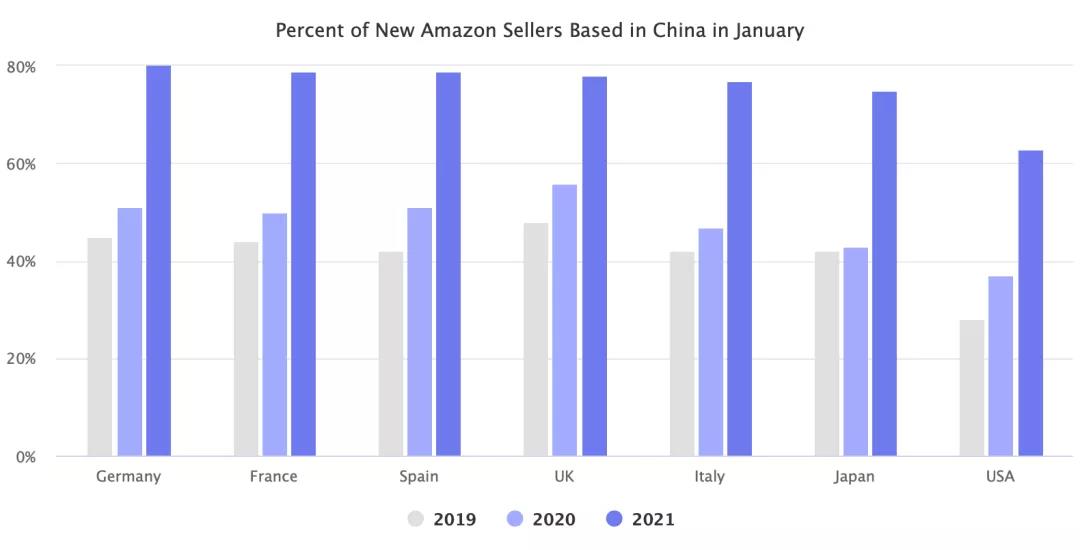 早在2021年1月份,有媒體報(bào)道,中國賣家占亞馬遜新賣家75%,比2020年的47%有了大幅增長,中國賣家GMV市場份額一直有擴(kuò)大趨勢。原以為這一瘋漲的勢頭將會帶來一個(gè)不錯(cuò)的成績單,沒曾想,今年4、5月份的“封號潮”來勢洶洶,徹底將這一上升趨勢打破。過去五年,中國賣家在亞馬遜全球市場的占比一直保持著上升的態(tài)勢:2017年從16%增至22%、2018年從23%增至26%、2019年從26%增至33%