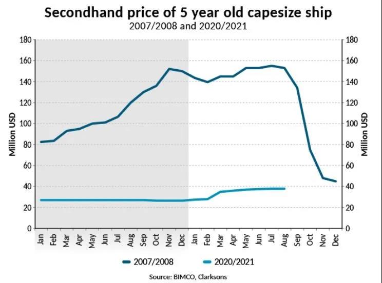 今年上半年,大宗商品價(jià)格飆升至多年高點(diǎn),干散貨運(yùn)價(jià)和船舶資產(chǎn)價(jià)格也有所上升,超過(guò)十年來(lái)大部分時(shí)間的平均水平,但BIMCO認(rèn)為仍未達(dá)到超級(jí)周期水平。BIMCO首席航運(yùn)分析師Peter Sand表示:目前大宗商品價(jià)格與2007年和2008年的水平相當(dāng),從而引發(fā)了業(yè)界關(guān)于超級(jí)周期的討論。然而,盡管與過(guò)去10年相比,干散貨運(yùn)價(jià)和船舶價(jià)值處于高位,但仍與2007-2008年的收益相去甚遠(yuǎn),且沒(méi)有大幅上漲的跡