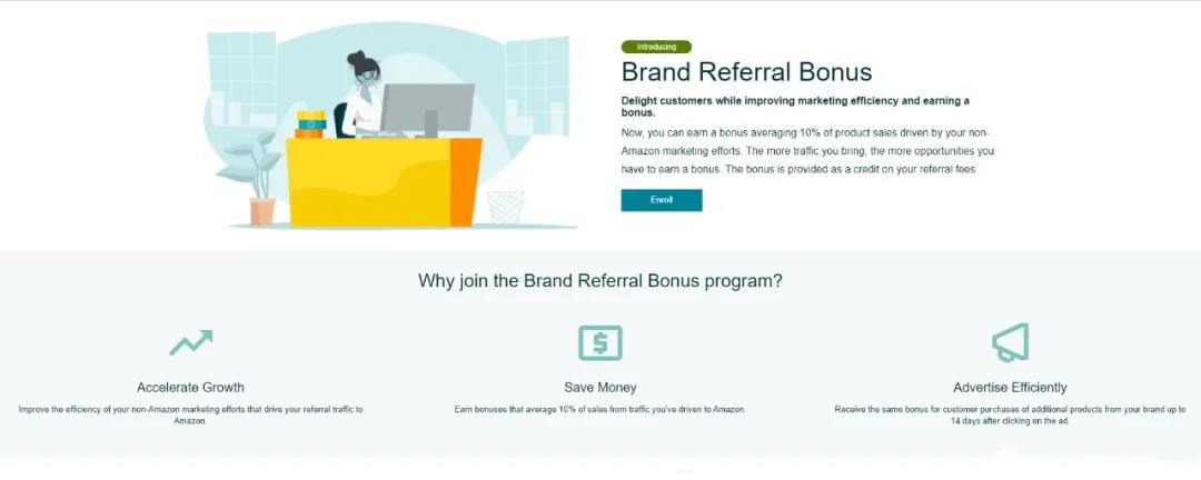 近日,小編獲悉亞馬遜推出了一項新計劃,以獎勵在其市場上推動銷售的品牌。與其聯(lián)盟營銷計劃類似,品牌引流獎勵計劃(Brand Referral Bonus program)為參與品牌的非亞馬遜營銷活動帶來的銷售額平均提供10%的獎勵。01品牌引流獎勵計劃的具體內(nèi)容與目的當賣家作為品牌推薦獎金計劃的成員,便可以獲得平均 10%的獎金,這些獎金是由非亞馬遜營銷工作推動的產(chǎn)品銷售額。非亞馬遜營銷工作帶來的流