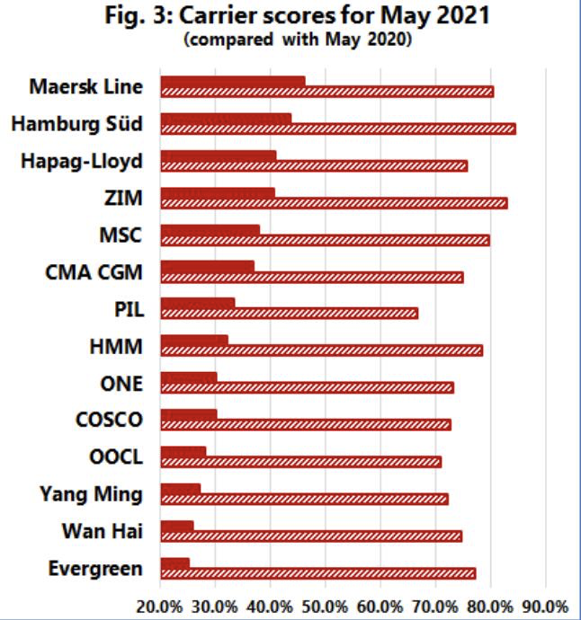 根據(jù)海洋情報(bào)咨詢機(jī)構(gòu)Sea-Intelligence的最新報(bào)告,由于全球范圍內(nèi)的港口擁堵和區(qū)域限制,使得當(dāng)前航運(yùn)業(yè)的準(zhǔn)班率處于極差水平。該報(bào)告涉及34條不同航線和60多家航運(yùn)企業(yè)。結(jié)果顯示,5月份的準(zhǔn)班率比4月份下降了0.2%,僅為38.8%,同比大幅下降36%。據(jù)Sea-Intelligence的分析,在前14家航運(yùn)公司中,馬士基是今年5月份準(zhǔn)班率最高的公司,達(dá)到46.2%。另外,漢堡南美、赫伯