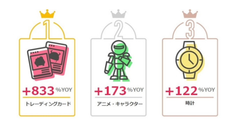 eBay日本根據(jù)2021年第一季度(1 ~ 3月)日本賣家在eBay上架售賣的商品,公布了2021年度第一季度期間日本暢銷商品的銷售動(dòng)向。 從2020年開始,由于新冠病毒帶來的消費(fèi)行為的變化,進(jìn)入2021年以后,海外跨境電商用戶仍在持續(xù)增加。3月由于美國的退稅,加上補(bǔ)助金和日元貶值等外部因素,以高級(jí)商品為中心的銷售額大幅增長。暢銷商品排行榜與前一季度相比,在各排行榜上持續(xù)活躍的是交易卡類