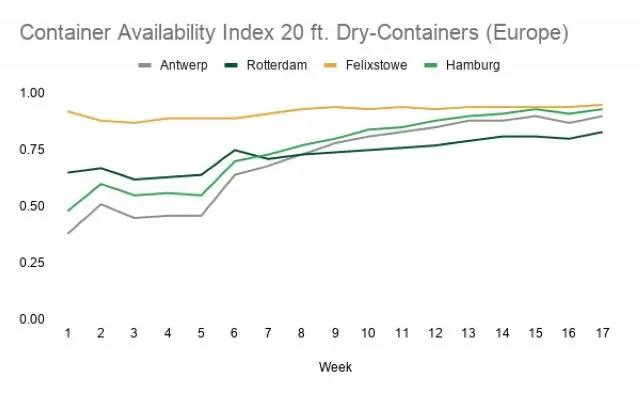 雖然蘇伊士運(yùn)河堵塞事件已基本平息,但對于全球港口而言,擁堵帶來的延遲效應(yīng)還在不斷傳導(dǎo),進(jìn)一步加劇了集裝箱流轉(zhuǎn)的難度。集裝箱監(jiān)測領(lǐng)域?qū)I(yè)機(jī)構(gòu)Container xChange的數(shù)據(jù)顯示,目前,集裝箱正源源不斷涌入歐洲主要港口。Container xChange發(fā)布的集裝箱可用性指數(shù)顯示,歐洲三大主要港口——荷蘭鹿特丹港、比利時(shí)安特衛(wèi)普港以及德國漢堡港,正見證著蜂擁而至的集裝箱。據(jù)了解,上述三大港口在